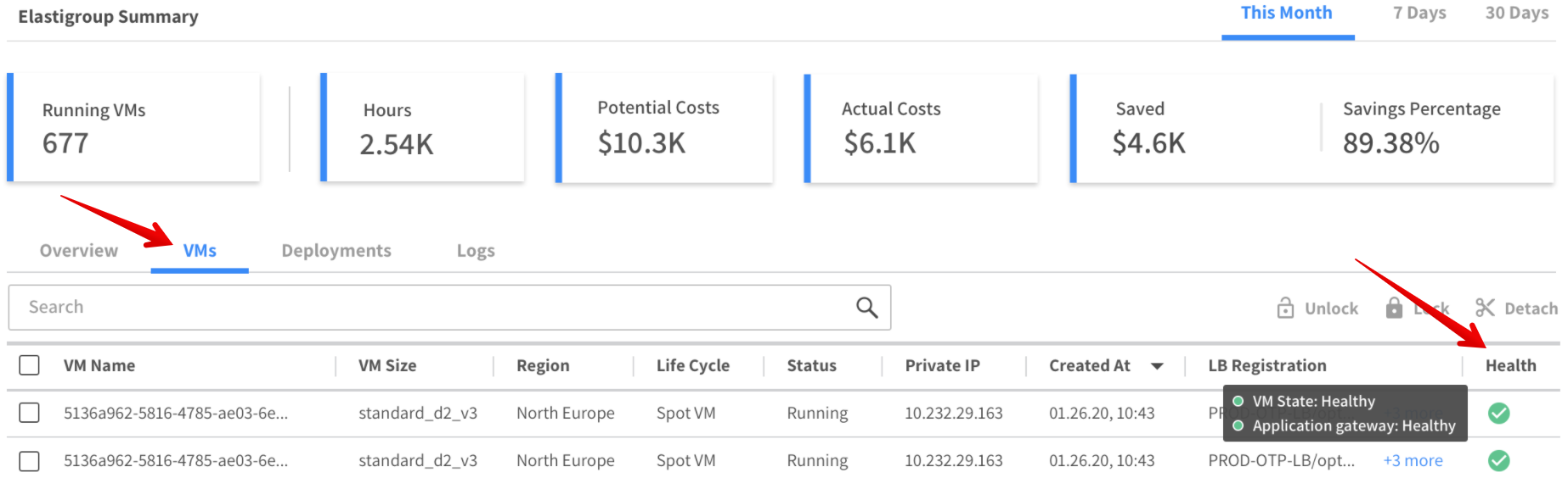 In your Elastigroup, click the VMs tab. In the table of VMs, you can see the Health column with status icons displayed.